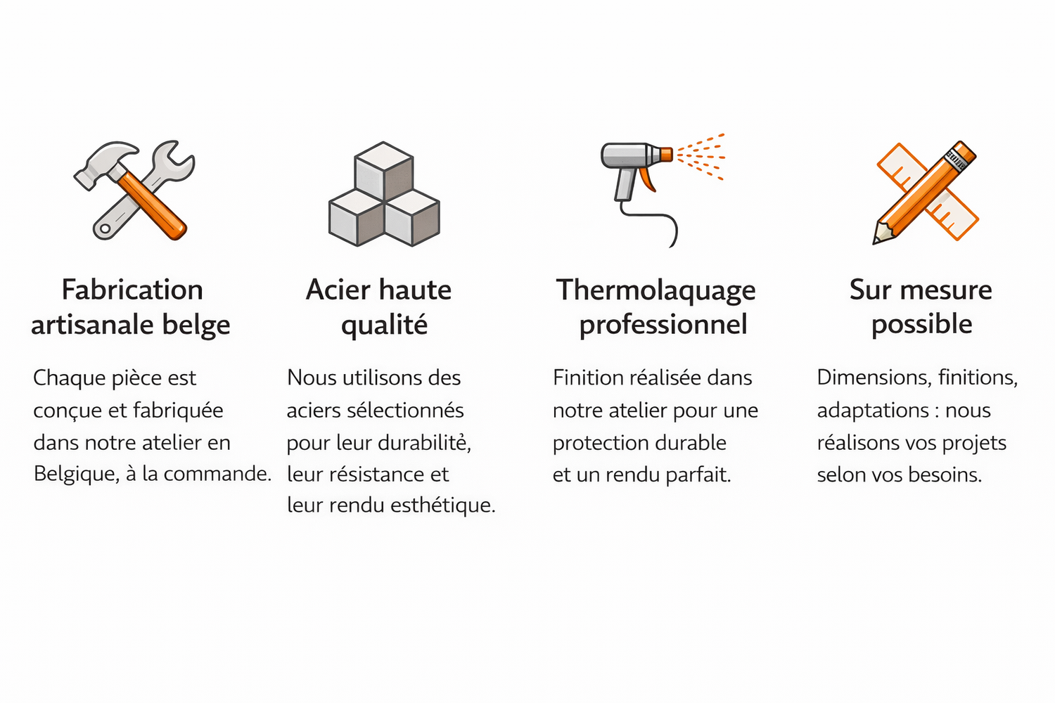 Basé à Awans, près de Liège, nous accompagnons particuliers et professionnels dans la réalisation de projets métalliques uniques, alliant design, précision et durabilité.